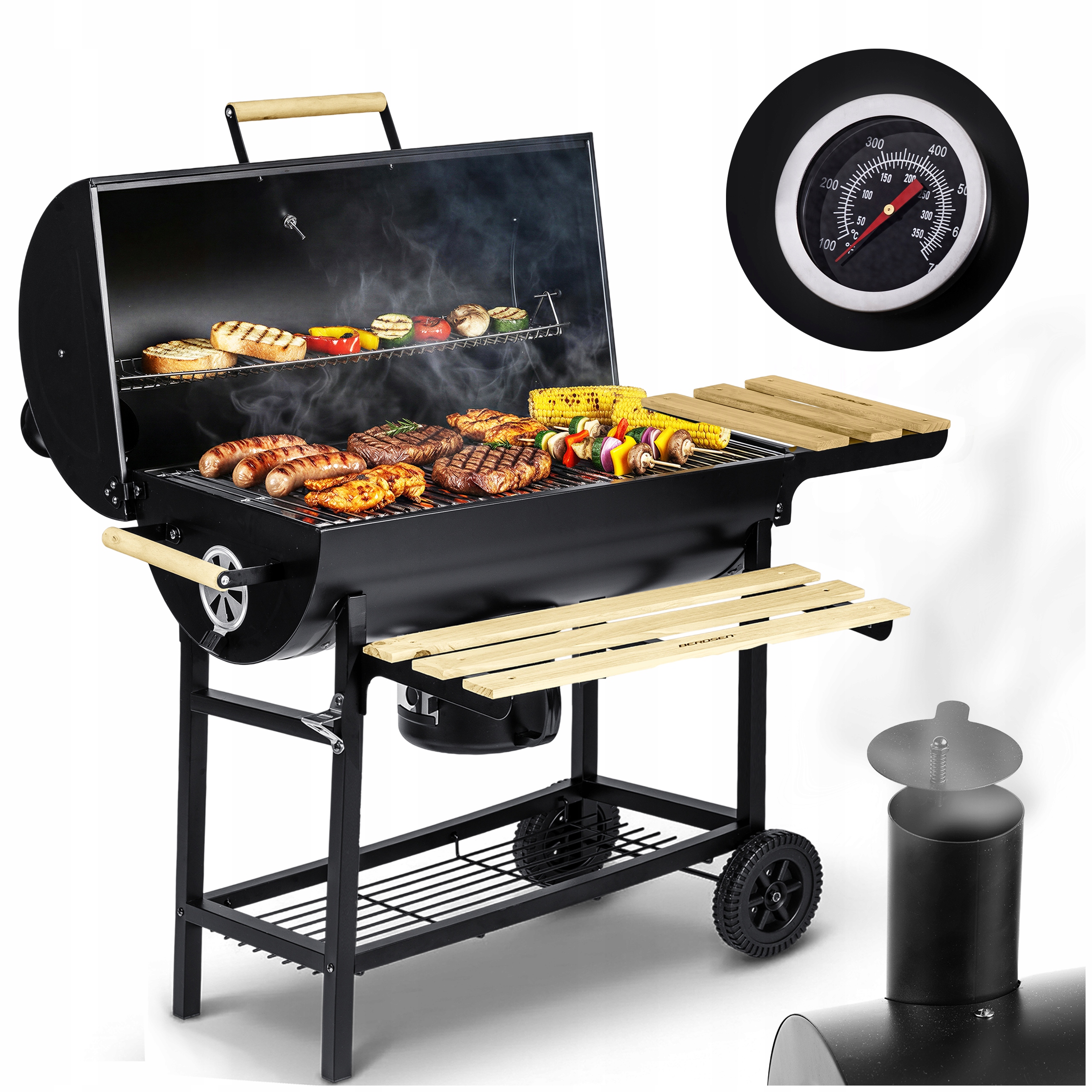 GRILL OGRODOWY WĘGLOWY BECZKOWY | KOMIN | TERMOMETR | POPIELNIK | XXL Cechy dodatkowe kółka pokrywa półka popielnik regulacja rusztu termometr wiatrochron